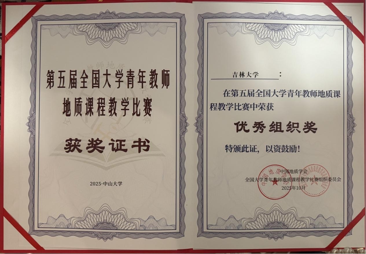 教学委员会主任彭晓蕾教授率领,参赛教师包括唐杰教授、董玉副教授、杨群副教授,单玄龙院长受邀以评委专家身份出席了会议。三位参赛教师凭借扎实的教学功底、创新的教学设计及出色的临场表现,从众多参赛选手中脱颖而出,分获特等奖、一等奖和二等奖。同时,为表彰我校的优异表现,中国地质学会和全国大学青年教师地质课程教学比赛组织委员会联合授予吉林大学“优秀组织奖”。