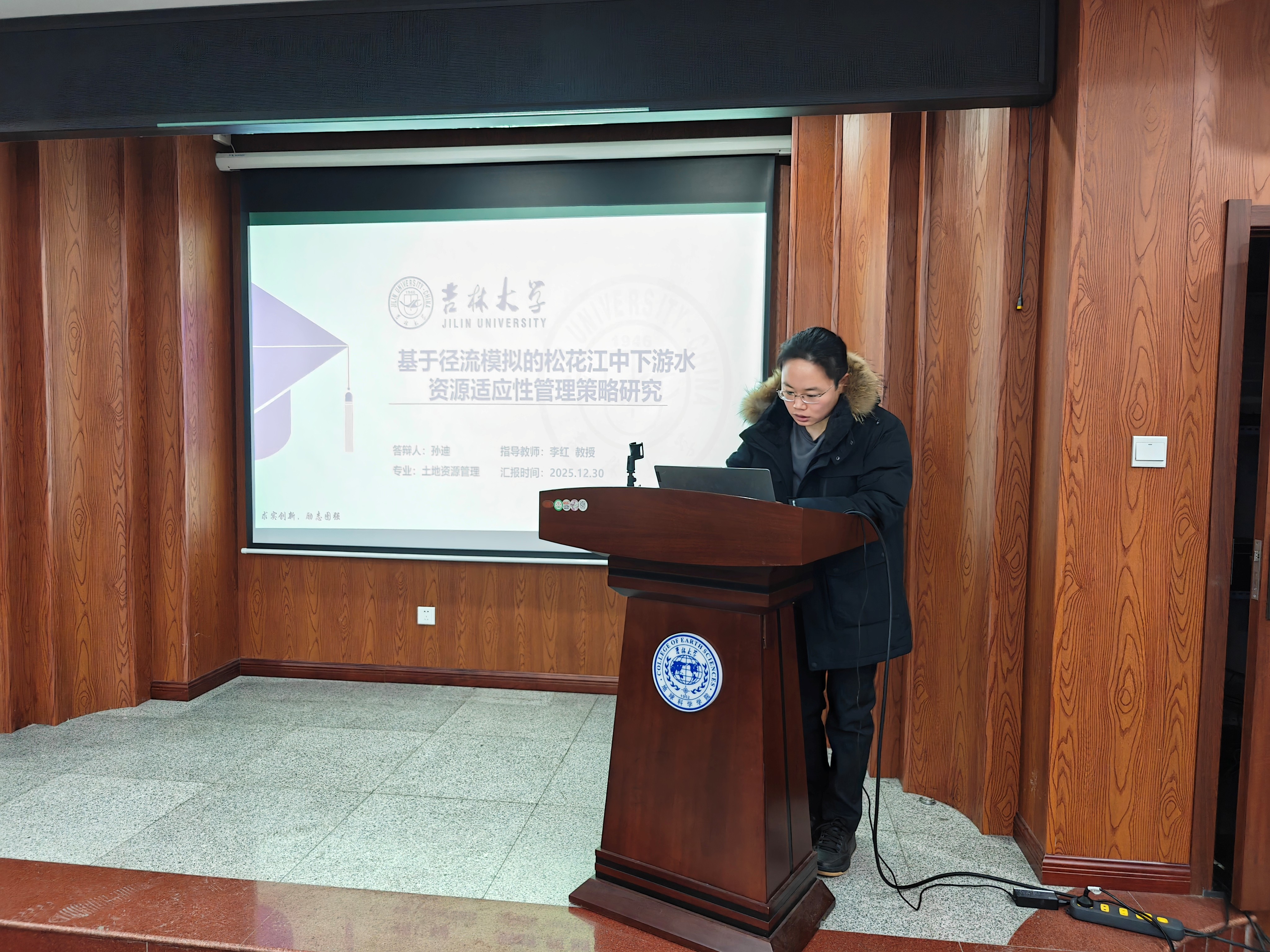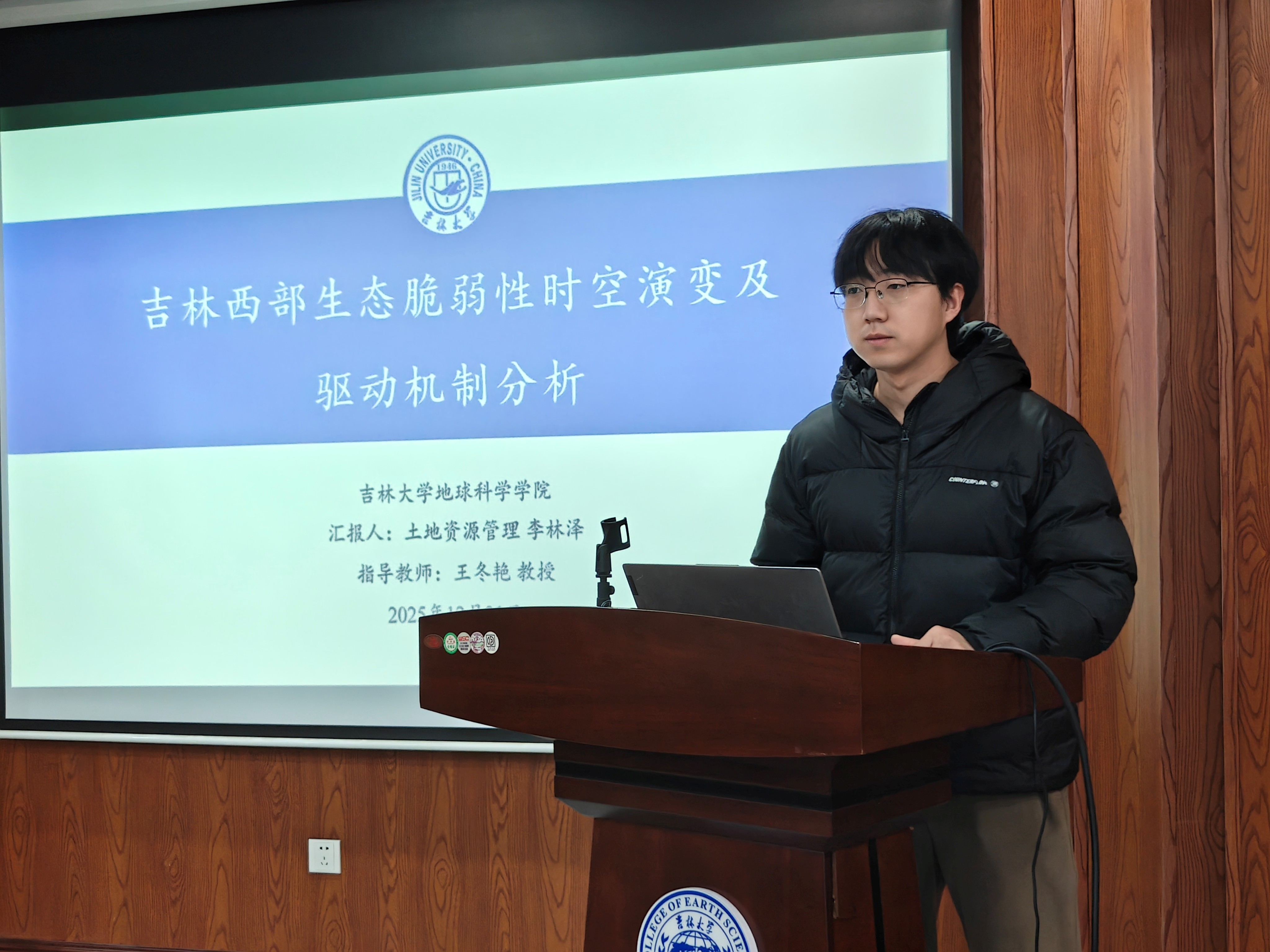 活动上,孙迪以径流模拟为技术支撑,探究了松花江中下游水资源适应性管理的可行策略;方涵涵借助系统动力学模型,对长春市城市韧性开展了评价分析与趋势预测;张紫燕聚焦长三角地区城市人居环境,深入剖析其网络架构特征及背后的驱动影响因素;卢仕祺针对宝清县粮食作物开展专项研究,完成作物识别的同时对其环境适宜性进行了综合评价;李林泽围绕吉林西部生态脆弱性这一核心议题,揭示了其时空演变规律与内在驱动机制。