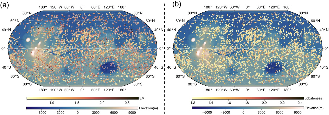 在火星撞击坑层状溅射物(LCE)识别方面,课题组提出了一种新型深度学习模型——EMHSEU UNetLCE通常呈现层状同心环状溅射结构,其形成与地下挥发性物质(如水冰)密切相关。随着火星影像分辨率的提升,传统人工识别方式难以高效处理海量数据。针对这一问题,该研究创新性地引入高效多尺度注意模块(EMA)和高效上采样卷积块(EUCB),显著提高了LCE的自动识别精度。与传统模型相比,EMHSEU UNetNASA行星数据系统(PDS)数据集上的表现更加出色。课题组还利用该模型成功更新了罗宾斯火星撞击坑数据库,首次系统性地补充了近3000个撞击坑的关键形态参数(喷出物流动性EM与叶状程度Г),为研究火星近地表含冰沉积物分布及水资源提供了重要依据。