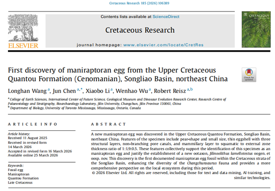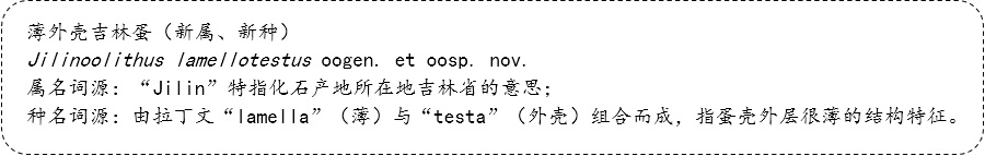 )科研团队报道了在我国东北松辽盆地晚白垩世泉头组(赛诺曼期)中发现的首例手盗龙类蛋化石,据此建立新属、新种薄外壳吉林蛋(Jilinoolithus lamellotestus oogen. et oosp. nov.),这一发现填补了松辽盆地白垩纪手盗龙类蛋化石研究材料的空白,为深入探索东亚地区晚白垩世陆地生态系统的演化及长春龙动物群的物种多样性提供了重要材料。