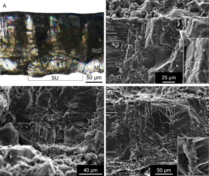 注:A 为偏光显微镜下乳突层与鳞状层边界,B 为扫描电镜下鳞状层与外层边界,C 为乳突层细节,D 为无分支孔隙结构(缩写:ML=乳突层,SqZ=鳞状层,EZ=外层,SU=壳单元)